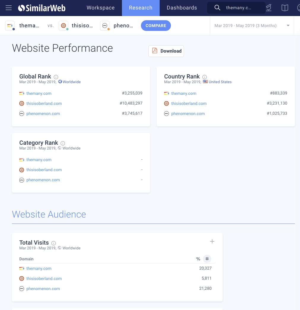 Here is a look comparing The Many to Oberland to Phenomenon. Interestingly, or not, given agency similarities, The Many and Phenomenon look a bit neck and neck in respect to total visits and rank.