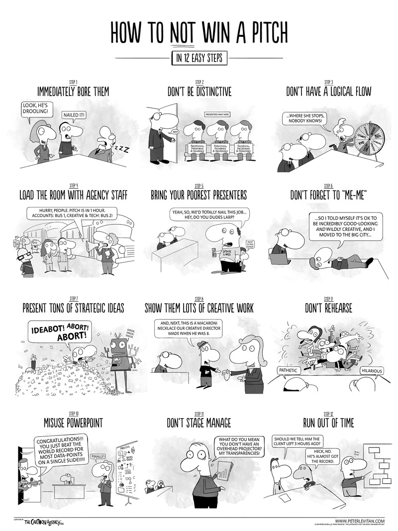 To help illustrate the “mistakes” that often accompany the act of an advertising agency’s new business pitch, I included 12 pitch mistake cartoons in my book “The Levitan Pitch. Buy This Book. Win More Pitches.”