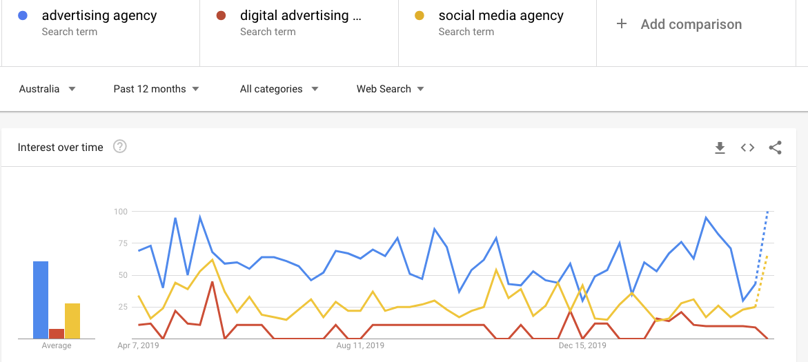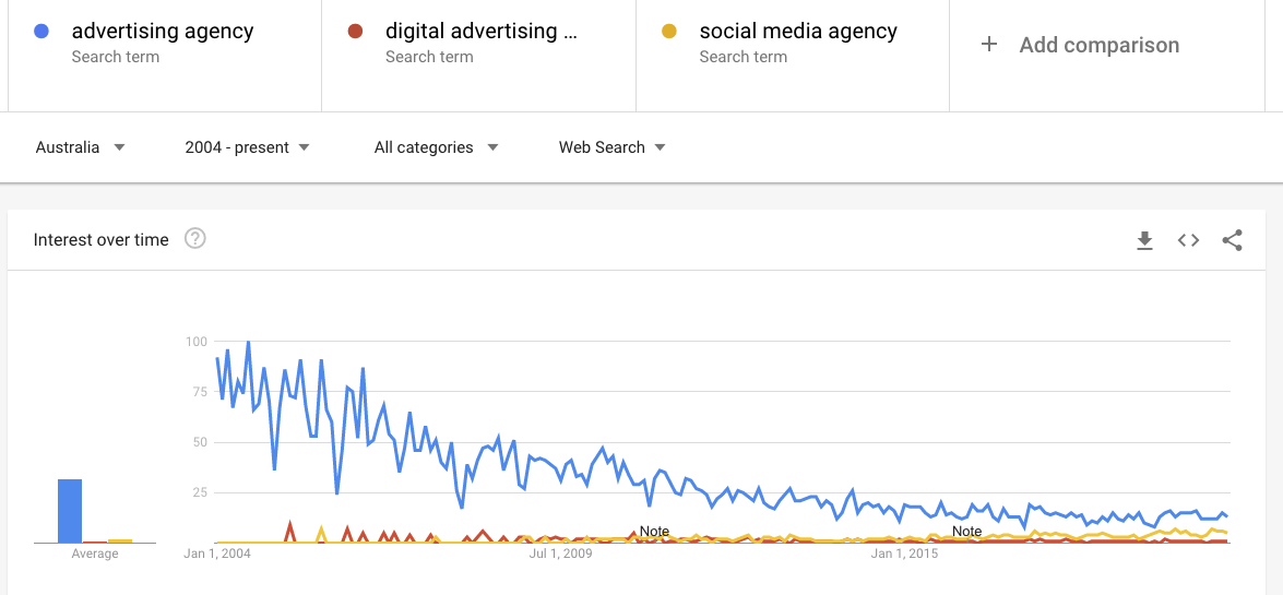 For an answer, let’s turn to big data since Google just might have the answer. According to search traffic, the answer is that “Advertising Agency” still works. Here are two charts that help us to understand the relative value of the term “Advertising.”