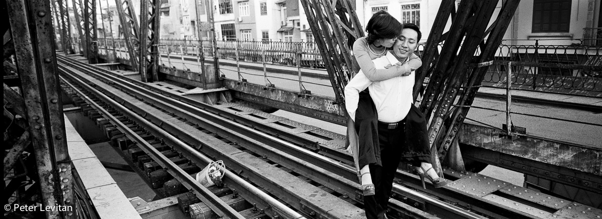 The photo below was shot on Hanoi’s Long Biên Bridge which was built in 1899-1902 by the architects Daydé & Pillé of Paris. The pedestrian, auto and rail bridge was one of the US Air Force’s favorite targets during the war. It is still standing. The bridge is now a big engagement and wedding backdrop. I shot this with my Widelux and film. I miss film.